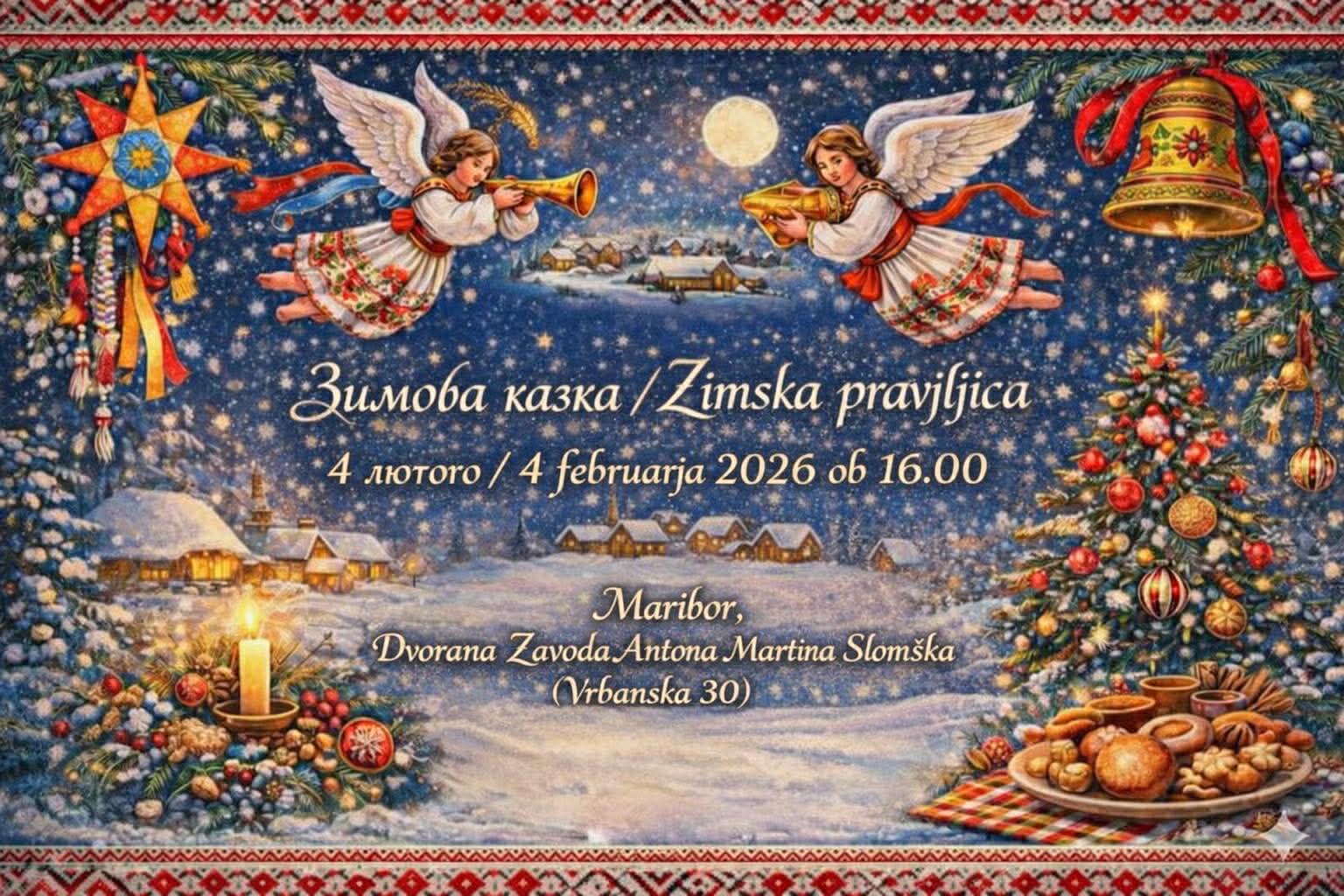 03.02.2026 Society of Ukranians in Slovenia TOGETHER Society of AKZ-Academy of Complementary Therapy Project “WINTER TALE” Dear compatriots! With great pleasure we invite you to the New Year’s performance “Winter Tale” Main goal of the project: to support and cheer up our compatriots Duration: January-February 2026. Location: territorial communities of Slovenia – Ljubljana, Postojna, Maribor, …